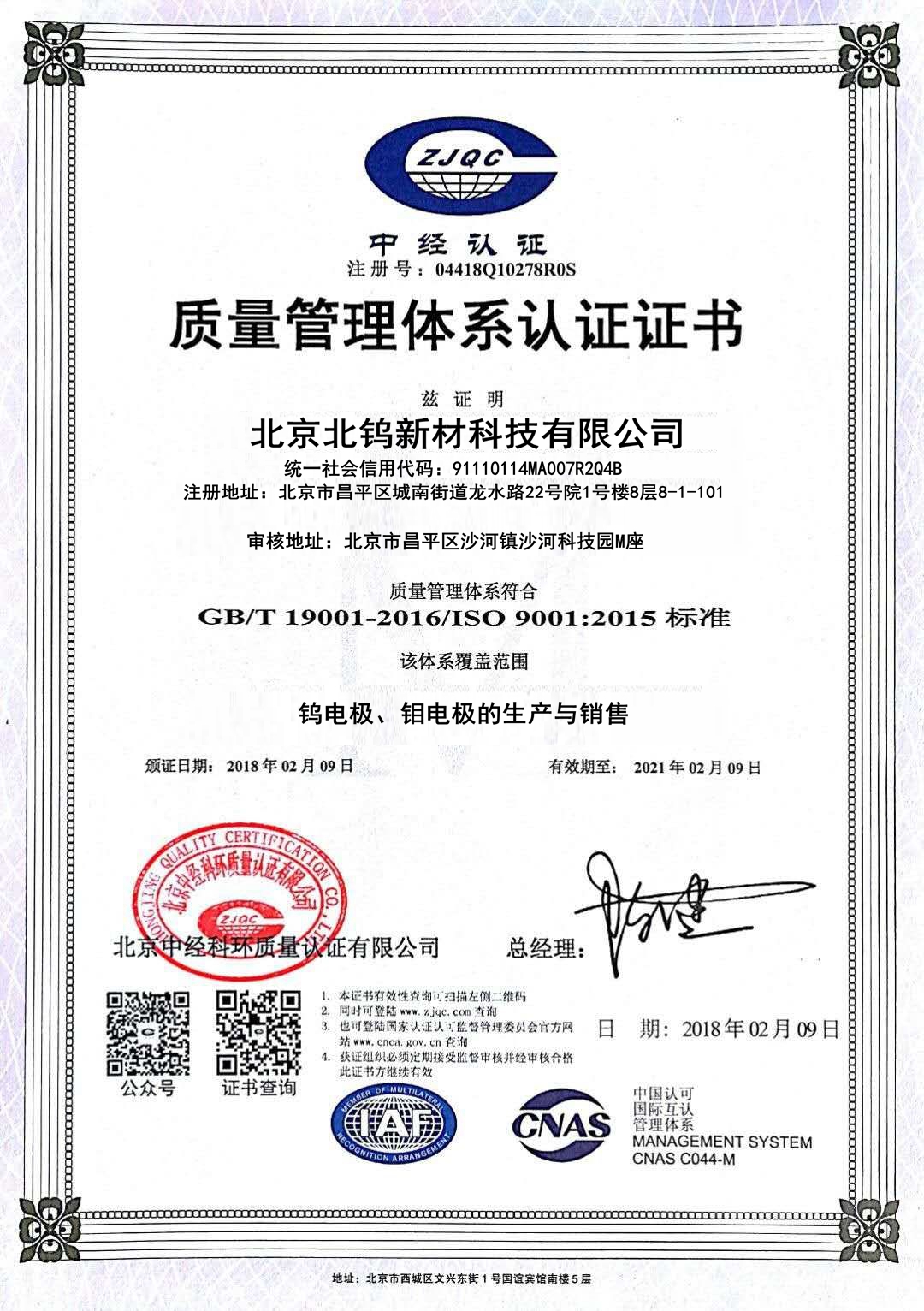 近日,北京北钨新材科技有限公司获得ISO9001:2015质量管理体系评审高分通过。在公司全体同事的通力合作下,经过认证公司专家的全面、严格、细致的指导和审核,确认我公司质量管理体系符合ISO9001:2015质量体系标准的要求,并于2018年2月9日,向我公司正式颁发了ISO9001质量管理体系认证证书。