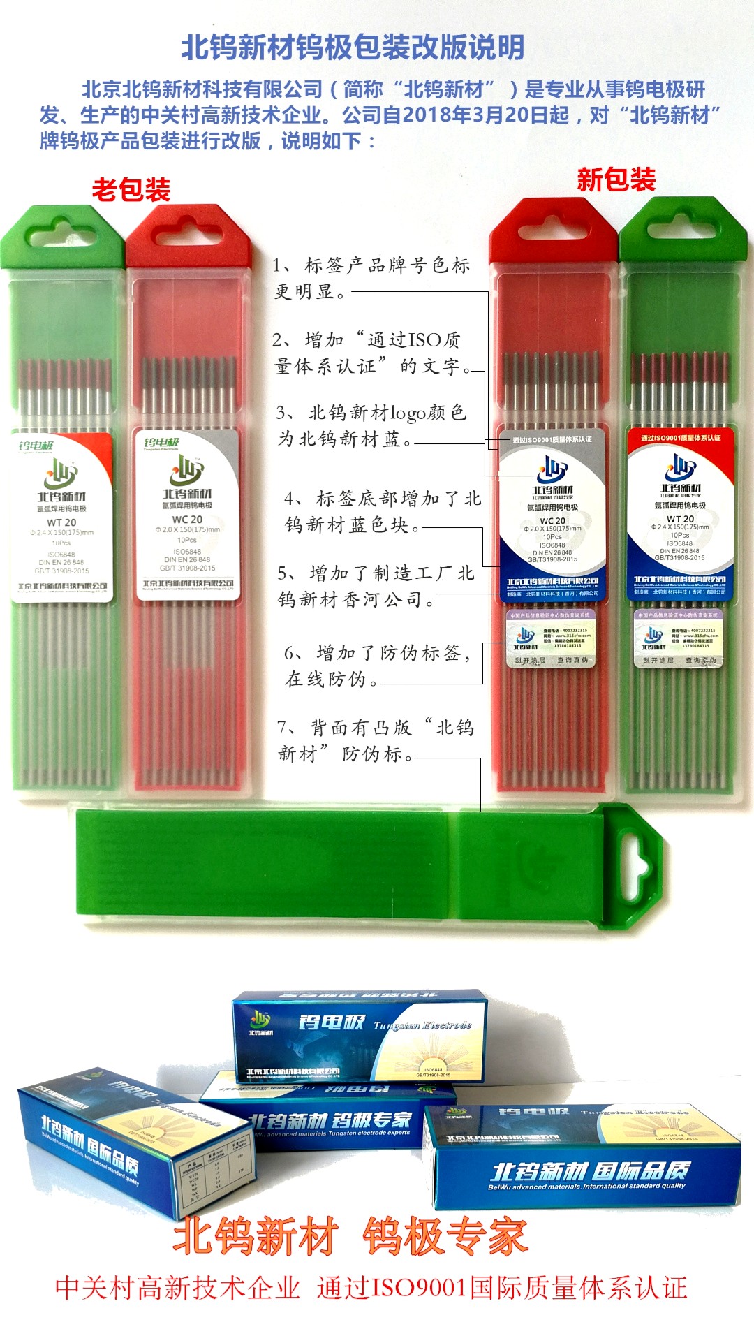 为了规范市场管理,提高产品竞争力,提高北钨新材产品的外观识别性,提升公司及产品品牌形象,从2018年3月20日起,特对“北钨新材”牌钨极产品包装升级改版,较之老包装,新包装的设计更加自然、流畅,品牌识别更清晰,体现了北钨新材公司的企业理念,敬请关注!